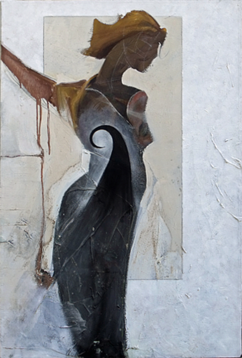 The decision has been made to paint the background of this painting red with a transparent glaze of Alizarin Crimson. Going over these gray-greens will darken the ground considerably and make the figure stand out.